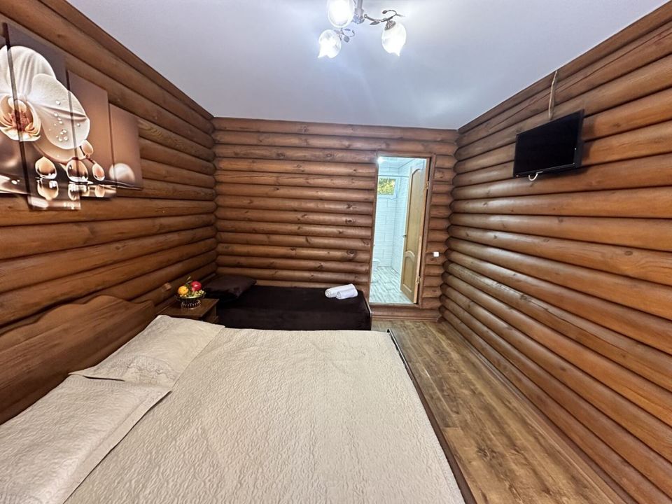 В каждом номере двуспальная кровать, односпальная кровать, шкаф, тумбочки, вешалка, при необходимости предоставляется еще одно спальное место.