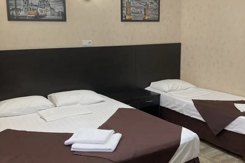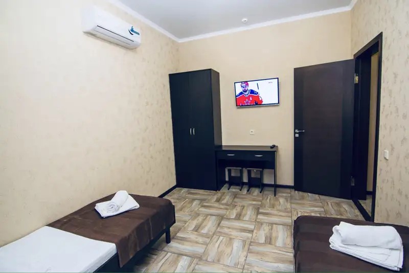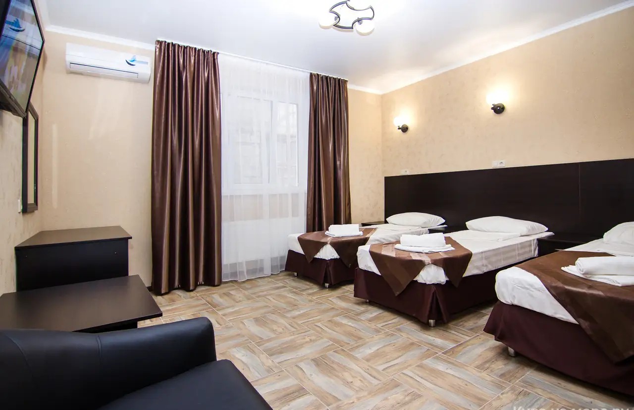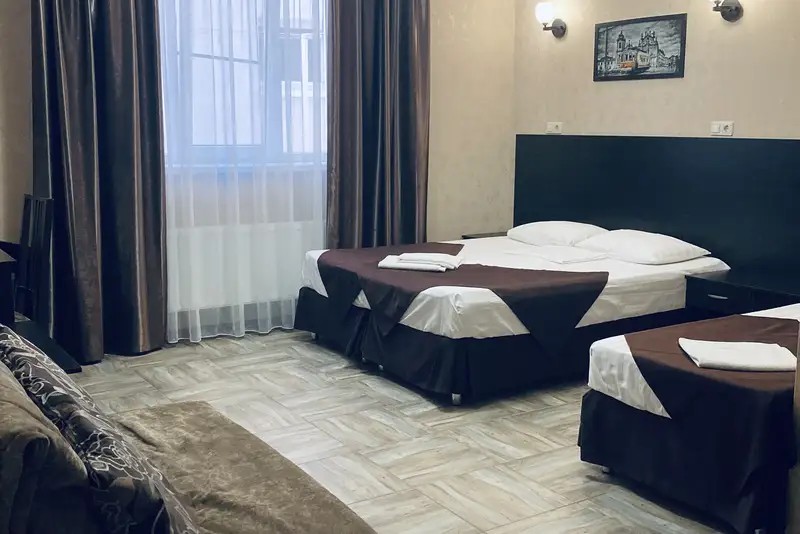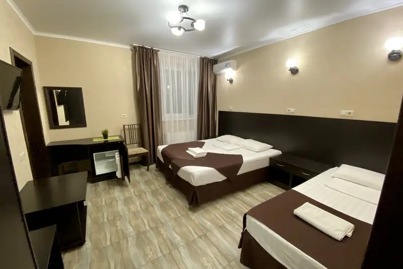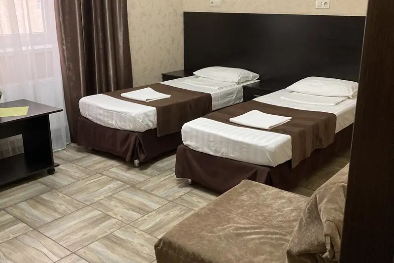 3-х местный номер по Вашему запросу может быть как с одной двуспальной кроватью и одной односпальной кроватью, так и с тремя раздельными односпальными кроватями. Номер оснащён необходимой мебелью, сплит- системой, ЖК телевизором (20 цифровых ТВ каналов), холодильником, феном. В номере имеется свой сан. узел с душевой кабиной. В номере есть бесплатный Wi-Fi.