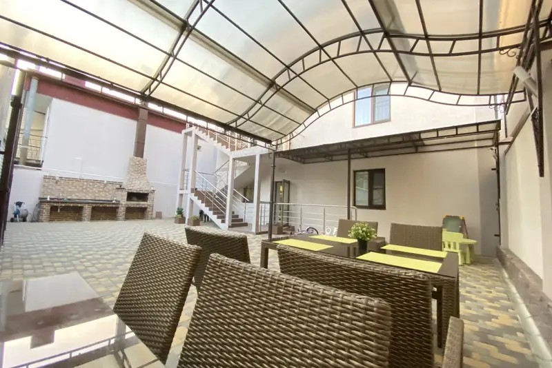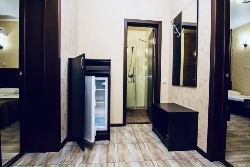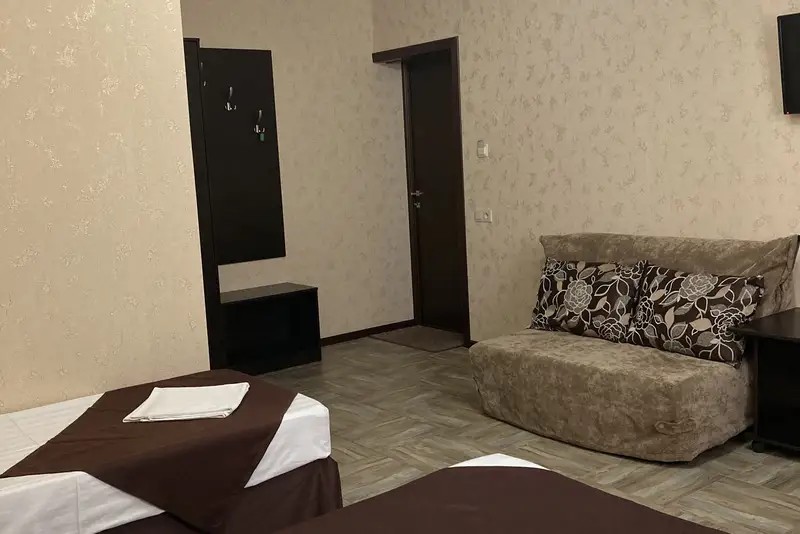 4-х местный номер состоит из 2х изолированных меблированных комнат и прихожей. В одной комнате имеется одна двуспальная кровать, во второй комнате имеются две односпальные кровати. В каждой комнате установлена сплит- система, и ЖК телевизор (20 цифровых ТВ каналов). Номер оборудован холодильником, электрочайником, феном. В номере имеется свой сан. узел с душевой кабиной. В номере есть бесплатный Wi-Fi.