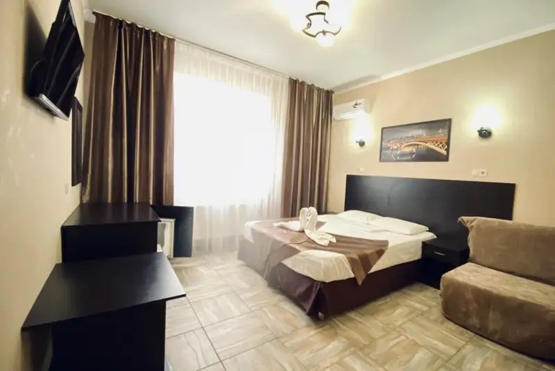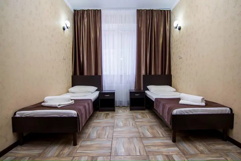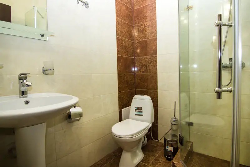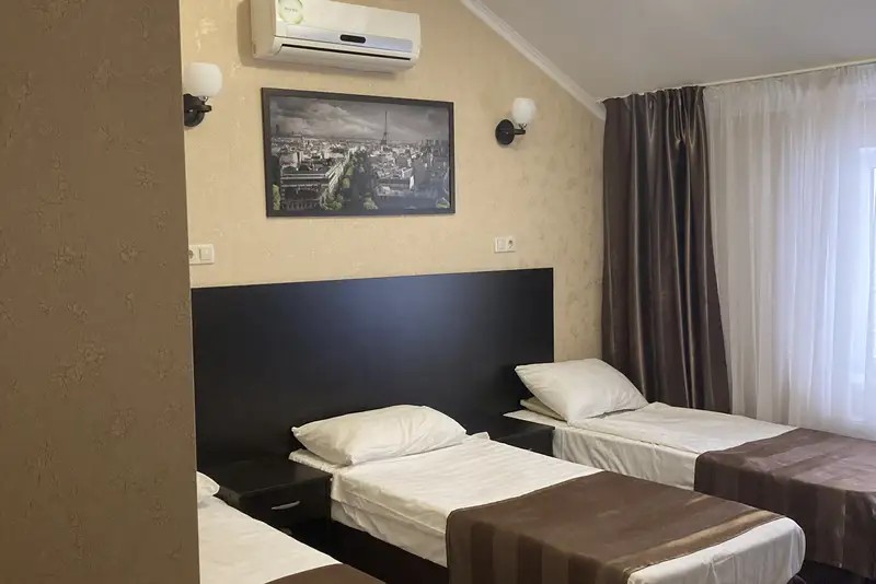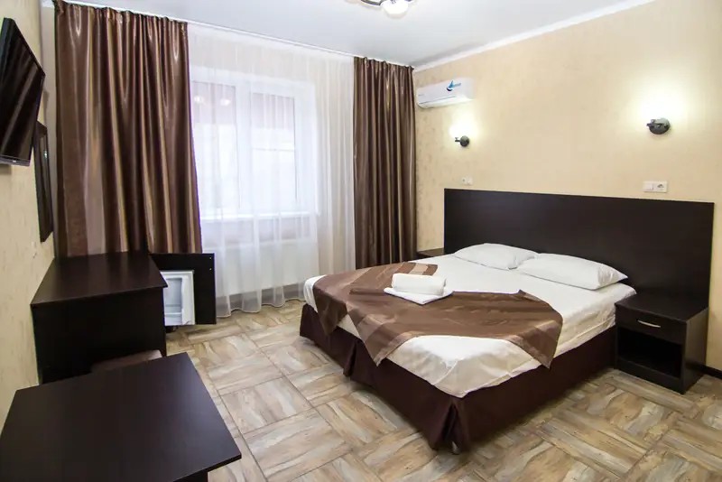 номер оснащён необходимой мебелью, сплит- системой, ЖК телевизором (20 цифровых ТВ каналов), холодильником, феном. Номер по Вашему запросу может быть как с одной двуспальной кроватью, так и двумя раздельными односпальными кроватями. В каждом номере имеется свой сан. узел с душевой кабиной. В номере есть бесплатный Wi-Fi.