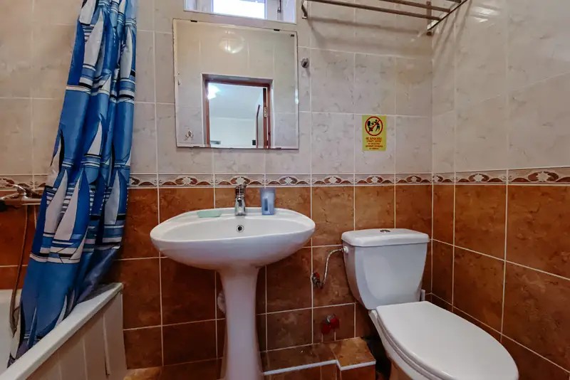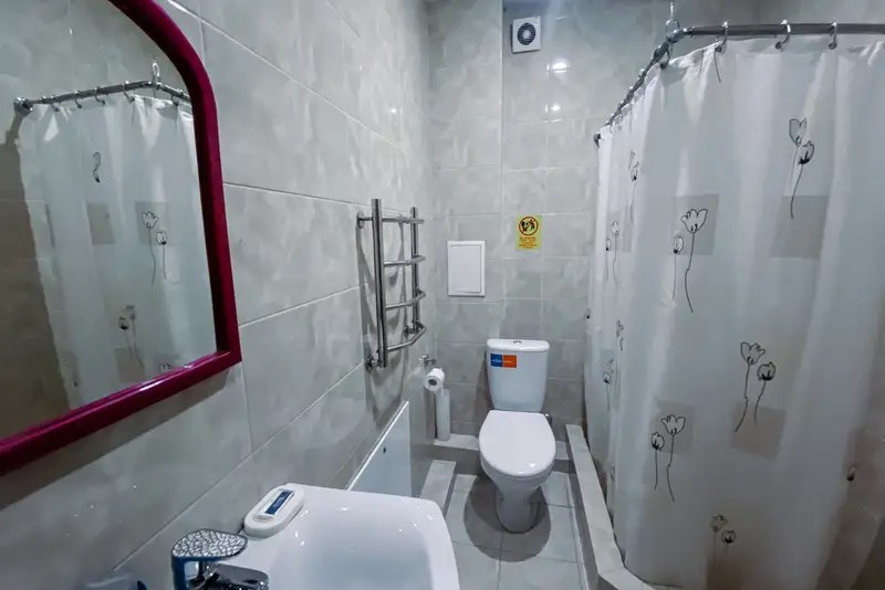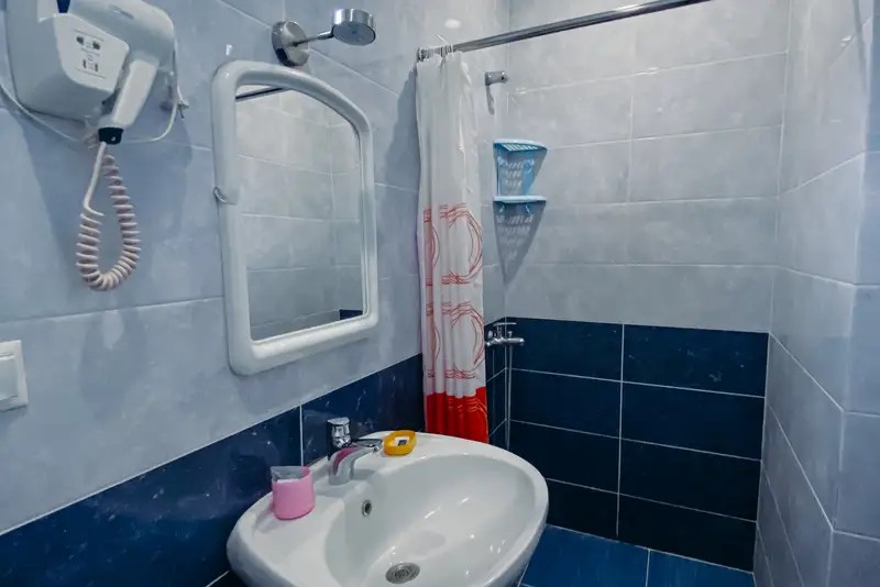 Душ или ванна, зеркало, фен, мыло, комплект полотенец, набор гостиничной косметики.