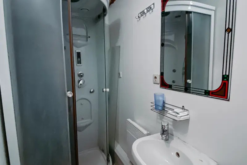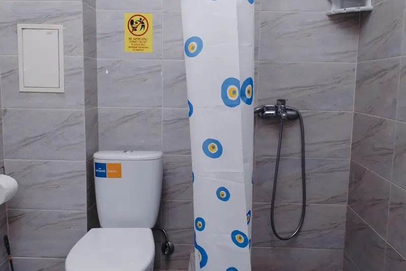 Душ, зеркало, фен, мыло, комплект полотенец, набор гостиничной косметики.