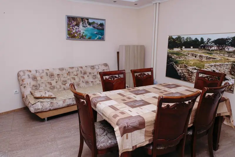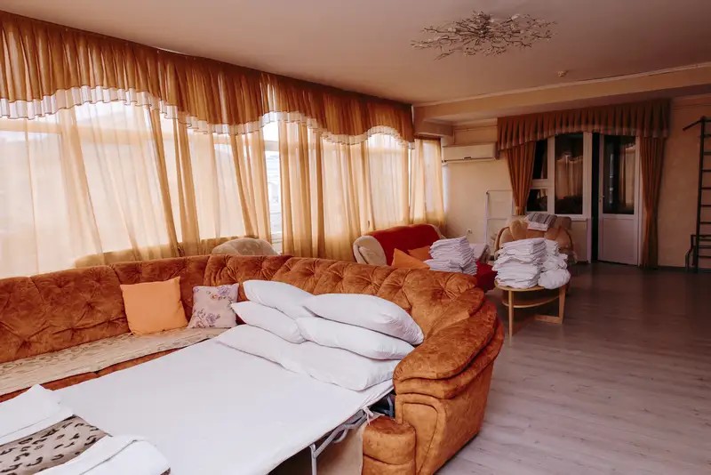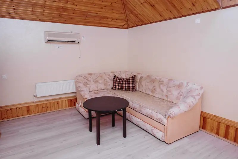 В зале: раскладной угловой диван, раскладной диван, 2 раскладных кресла, телевизор, кондиционер. В ванной комнате: Душ, зеркало, мыло, комплект полотенец, набор гостиничной косметики.
