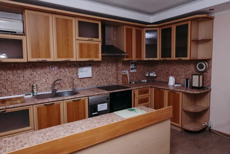 Кухня: диван, обеденный стол со стульями, кондиционер, холодильник, телевизор, варочная поверхность, духовой шкаф, мойка, посудомоечная машинка, чайник, посуда, сушилка для одежды.
