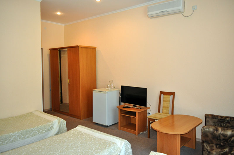 2-хместный без балкона, площадь номера 15-20 м2 С/у, ванная комната Кондиционер Телевизор Холодильник Шкаф для вещей Кресло Журнальный стол Две односпальные кровати, либо двуспальная кровать