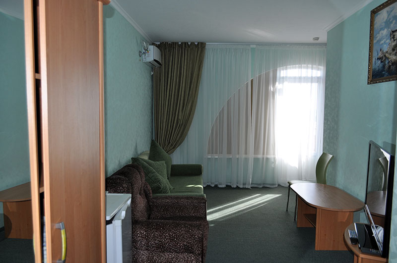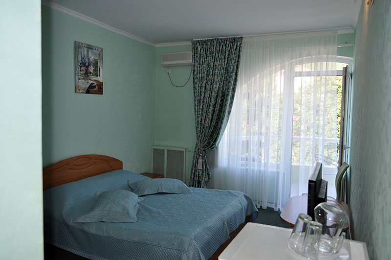 2-х местный с балконом, площадь номера 20 м2 С/у, ванная комната Кондиционер Телевизор Холодильник Шкаф для вещей Журнальный стол Двуспальная кровать