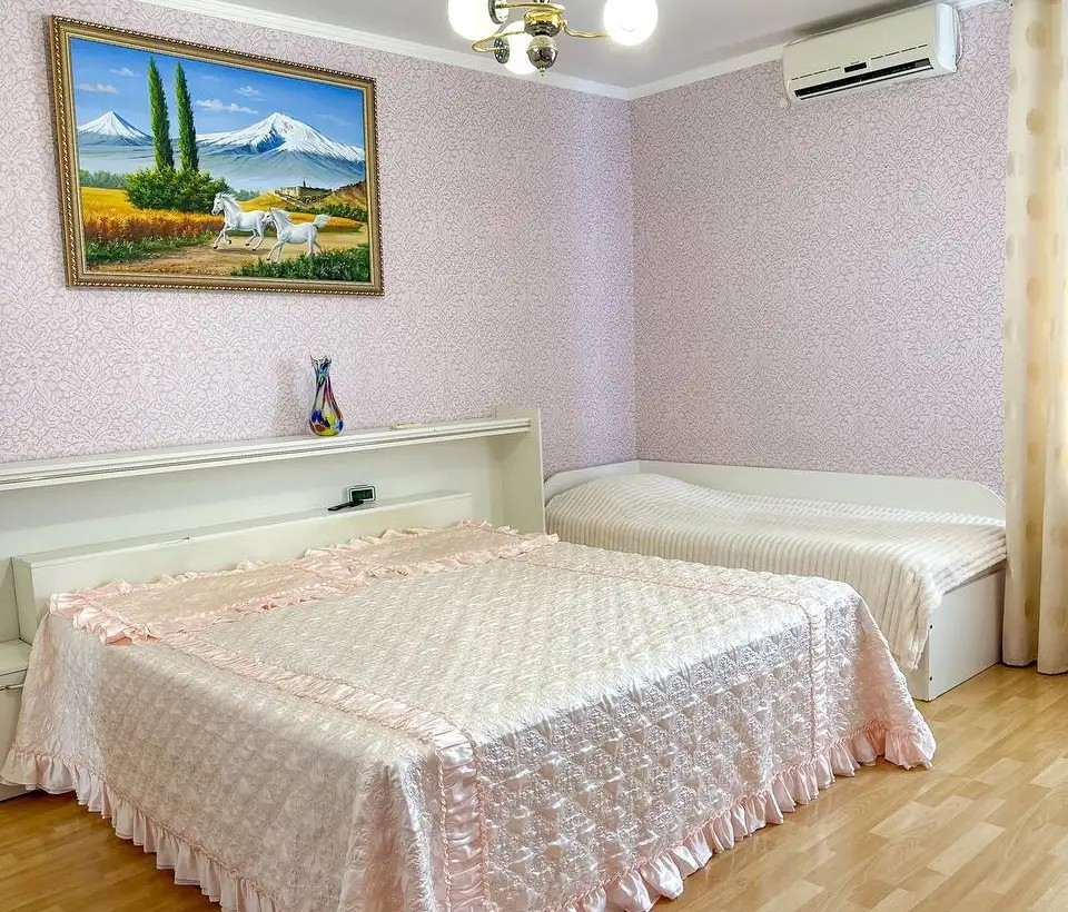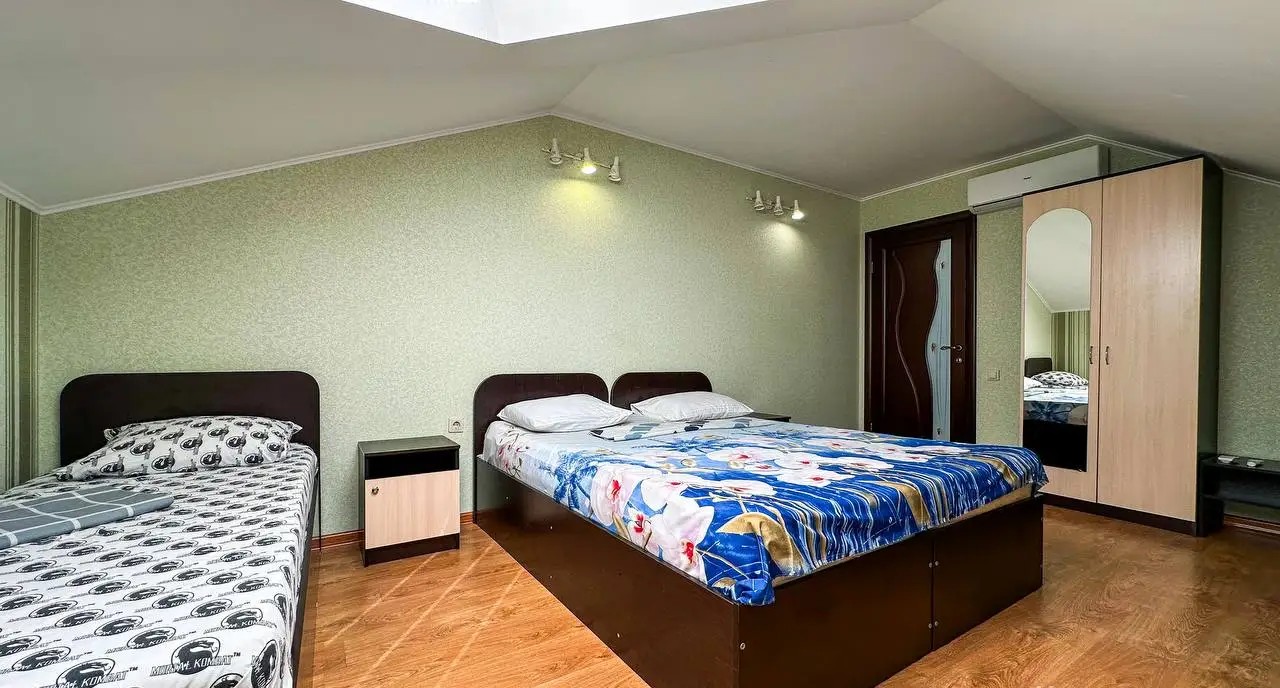 К вашим услугам 2, 3 и 4 местные номера — со всеми удобствами (кондиционер, телевизор, холодильник. полный санузел. с балконами 3 этаж! или общая терраса 2этаж. Предлагаем также 2-х комнатные номера «Люкс» и стандарт для компании или семьи. Номер включает в себя: сплит- систему, телевизор, холодильник, санузел раздельный, балкон. Бесплатный трансфер на песочный пляж 2раза в день на микроавтобусе! Время 9.30 до 13.00 и 16.00 8 минут пути) Рядом круглосуточные магазины и остановка городского транспорта (4 минут ходьбы). До центрального пляжа 25 минут ходьбы.