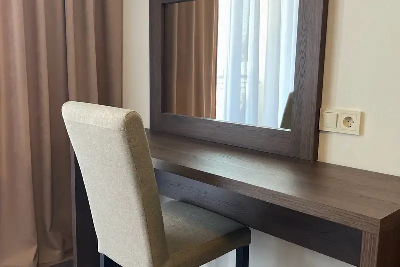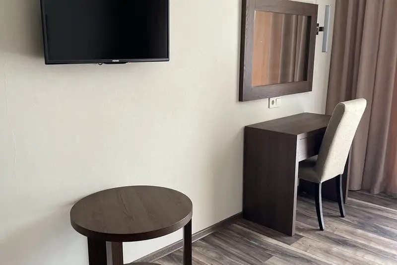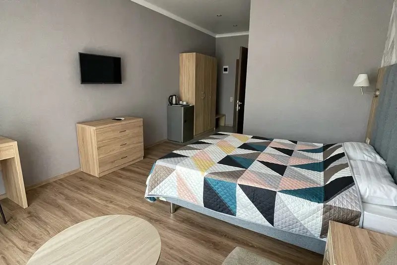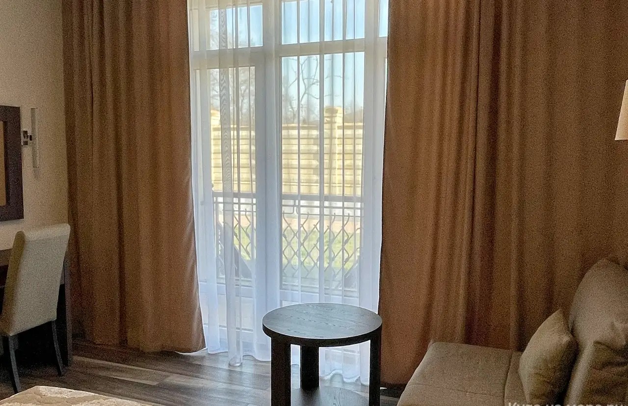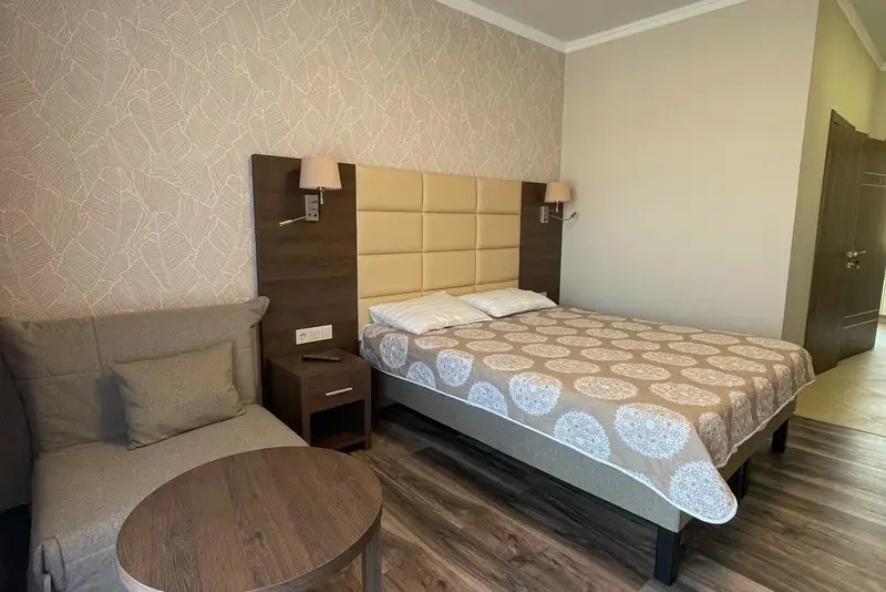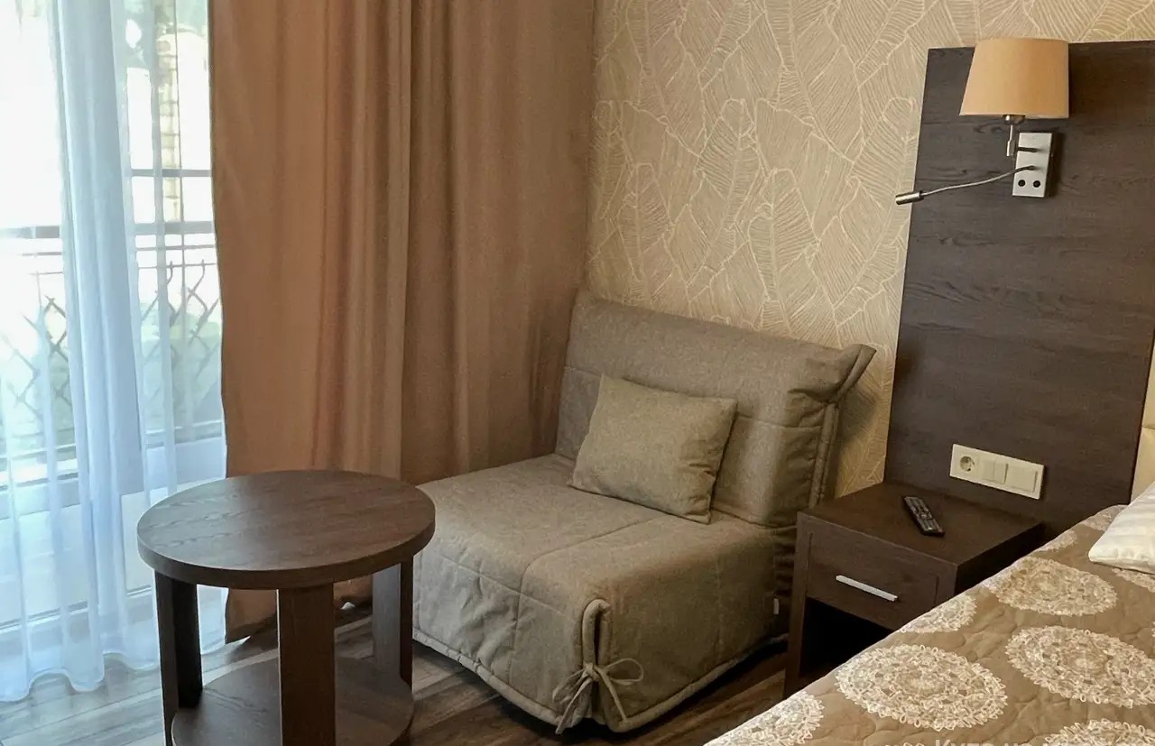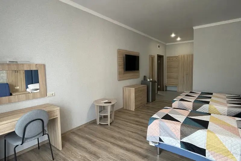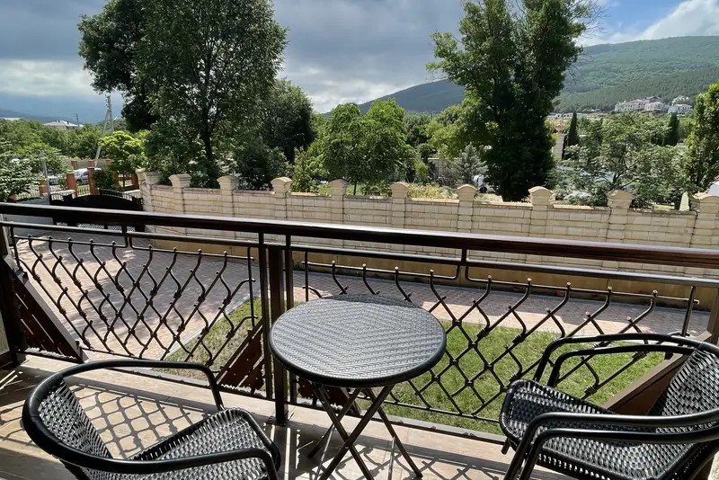 Двухместный номер с большим индивидуальным балконом, современным дизайном и новой мебелью. В номере двухспальная кровать (возможно два раздельных спальных места) две тумбочки, шкаф, письменный стол, стул, зеркало, чемоданница, вешалка. На балконе столик и кресла, сушилка для белья.