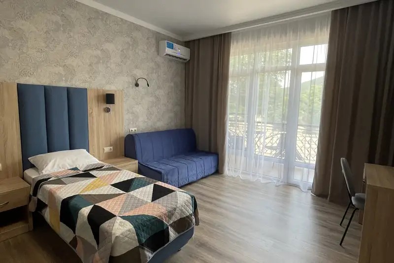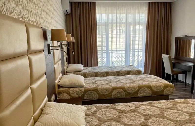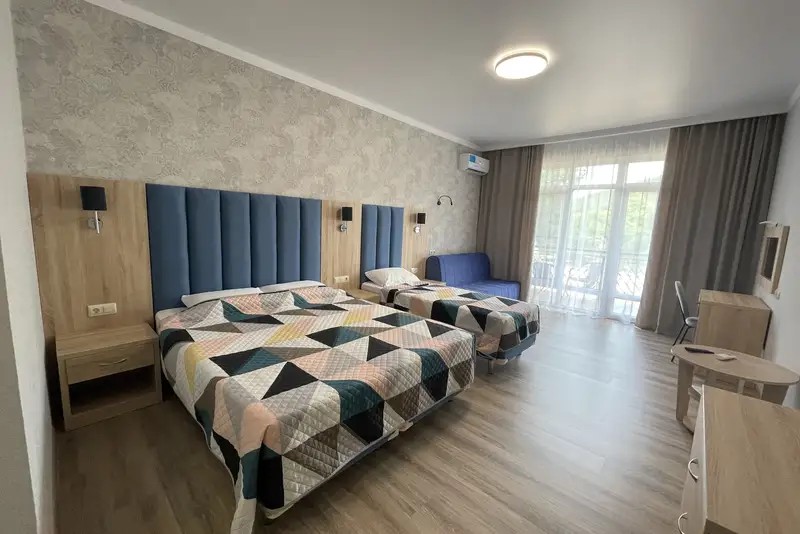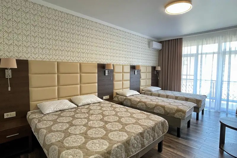 Трехместный номер с большим индивидуальным балконом: двухспальная кровать (возможно три отдельных спальных места) и односпальный диван-кровать. Шкаф, прикроватные тумбочки, стол, стул, вешалка, чемоданница. На балконе столик и кресла, сушилка для белья.
