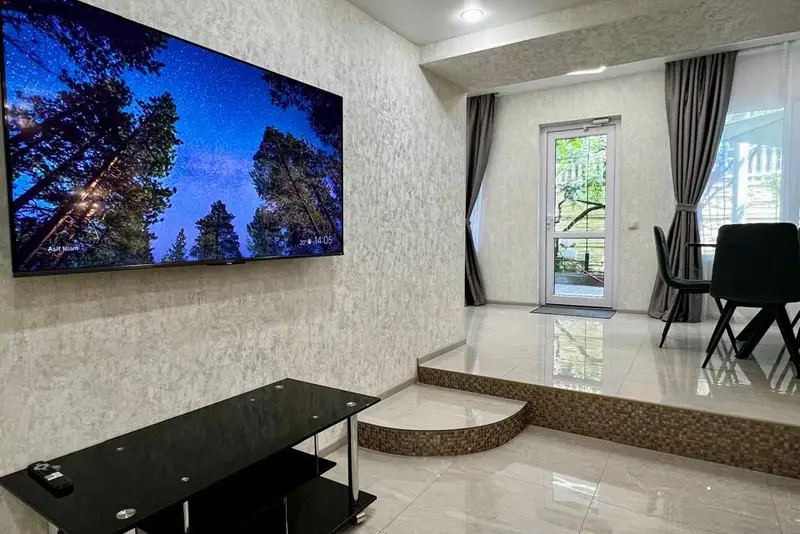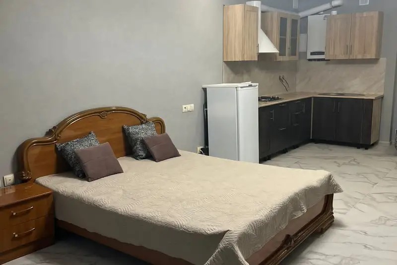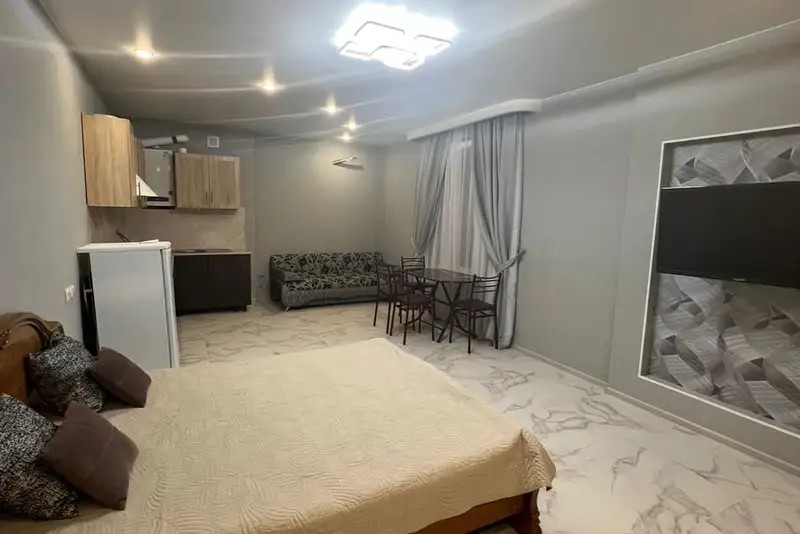 Одноэтажное здание отдельно от дома площадью 32 м.кв. Новый номер-студия с кухней. В номере санузел, тв плазма, холодильник, сплит-система, шкаф-купе, комод. Все новое. Кухня оборудована всей необходимой посудой, кухонной утварью, микроволновкой, чайником