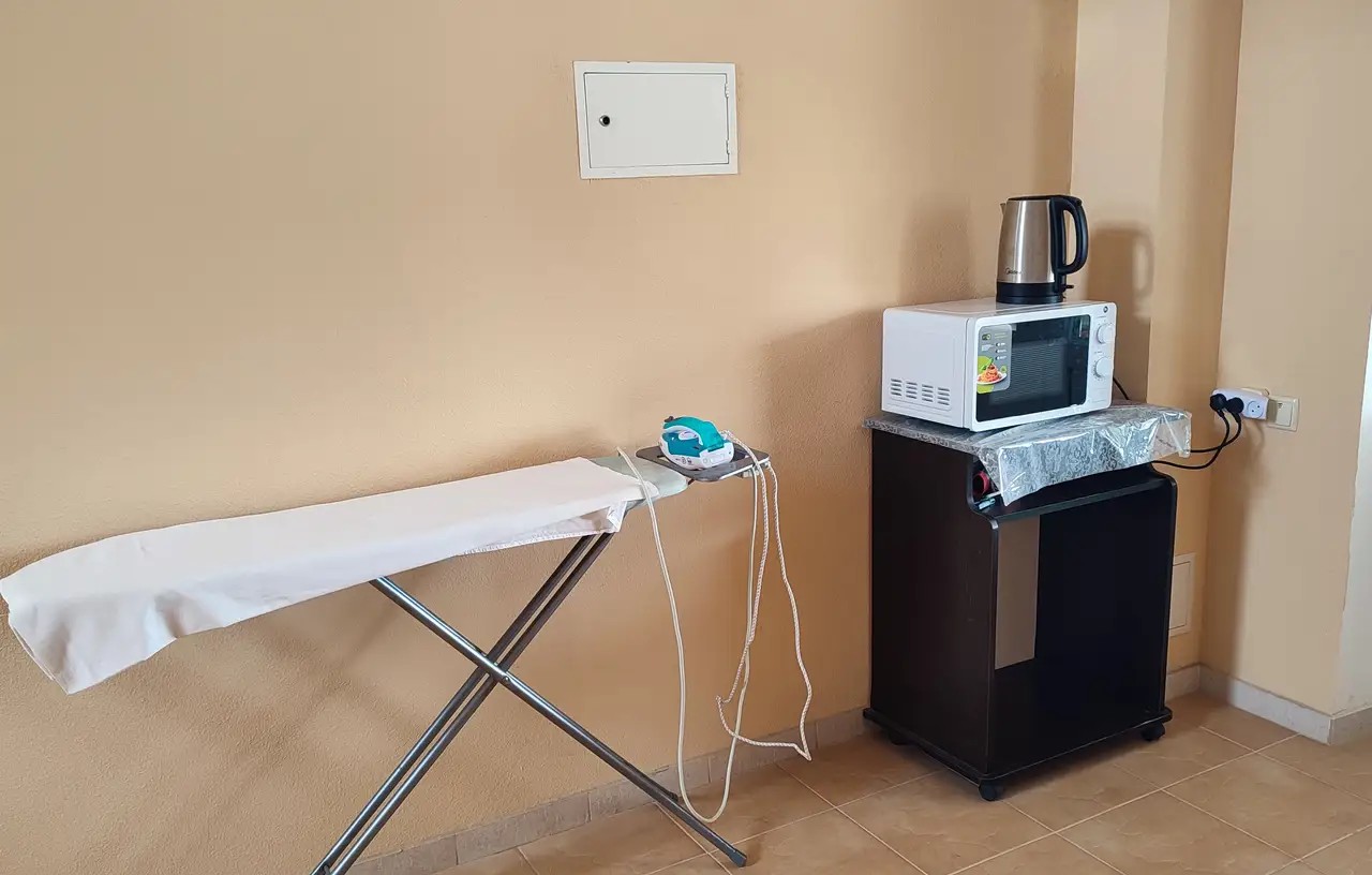 У нас нет общей кухни или питания, однако на этаже имеется электрочайник и микроволновка, а в номере — базовая посуда.