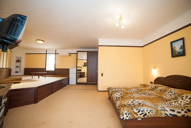 Просторный однокомнатный номер в восточном стиле с видом на море и горы Судака. Ночью открывается завораживающий вид на мерцающий курорт.