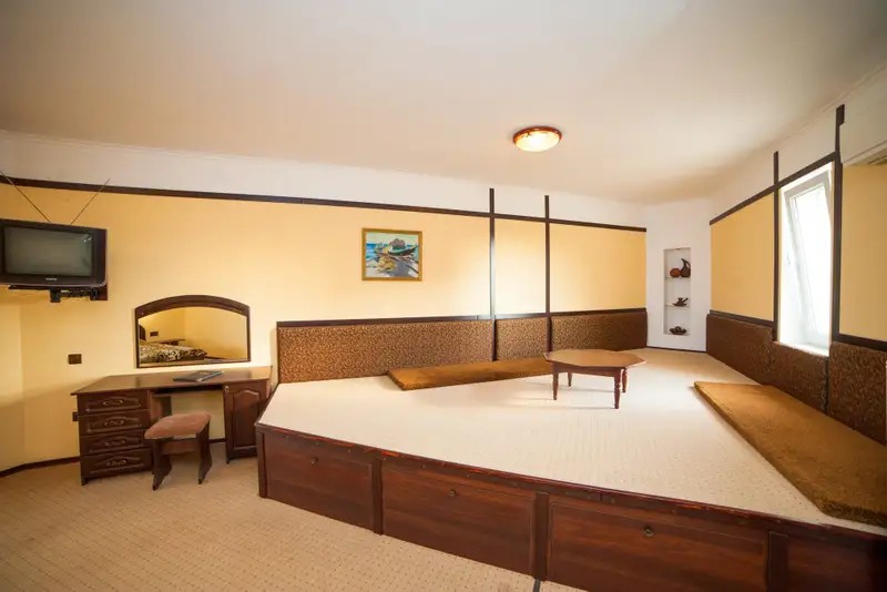 Спальные места: двуспальная кровать, раскладной диван-кровать и тапчан в восточном стиле.