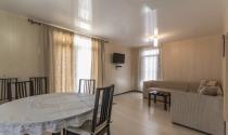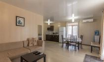 Номер 3 с панорамным видом на море. В номере большая гостиная- столовая-кухня в которой стоит большой угловой диван. В спальне расположены двухспальная и полуторная кровати. Номер так же рассчитан на пять человек, оснащён всей техникой и посудой. Санузел совместный.