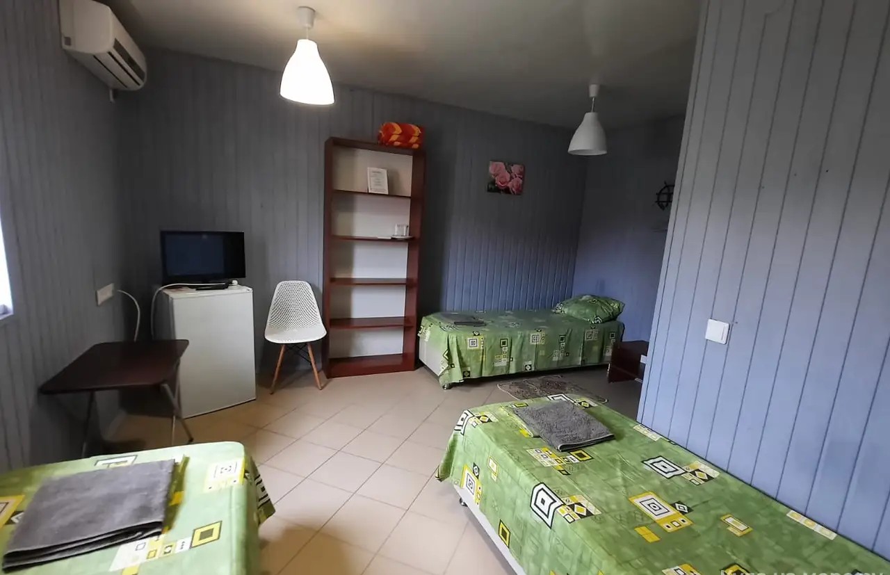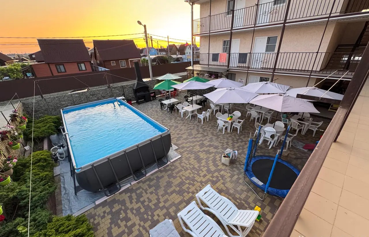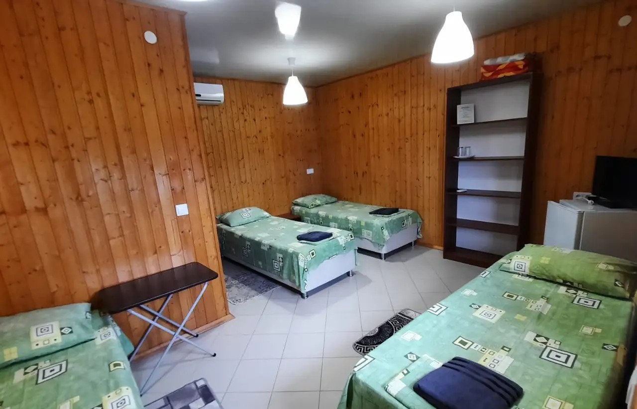Помимо шестнадцати уютных современных номеров, рассчитанных на 3−4-местное заселение (с возможностью доукомплектования дополнительным спальным местом), в гостинице есть уютный закрытый двор со столиками, шезлонгами, детскими игрушками, теневой зоной, батут, бассейн. К услугам отдыхающих бесплатный WI-FI. В номерах кондиционер, холодильник, телевизор, душ, туалет. Установлена новейшая система безопасности, круглосуточное видеонаблюдение. Номера отделаны экологическими материалами из древесины, имеется сейф. Также на территория работает кафе «Домашняя еда) Комплекс на человека в день — 1000 руб. Выделено специальное место для курения. Отдыхающие в нашей гостинице бесплатно пользуются утюгом, гладильной доской, феном. В наличии детские кроватки. За дополнительную плату возможны пользование стиральной машиной-автоматом. До муниципального пляжа 400 м. В шаговой доступности дельфинарий, аквапарк, зоопарк, крокодиловая ферма, продовольственные магазины (круглосуточные). Озеро с вулканической лечебной грязью находится на расстоянии 20-минутной пешей прогулки.