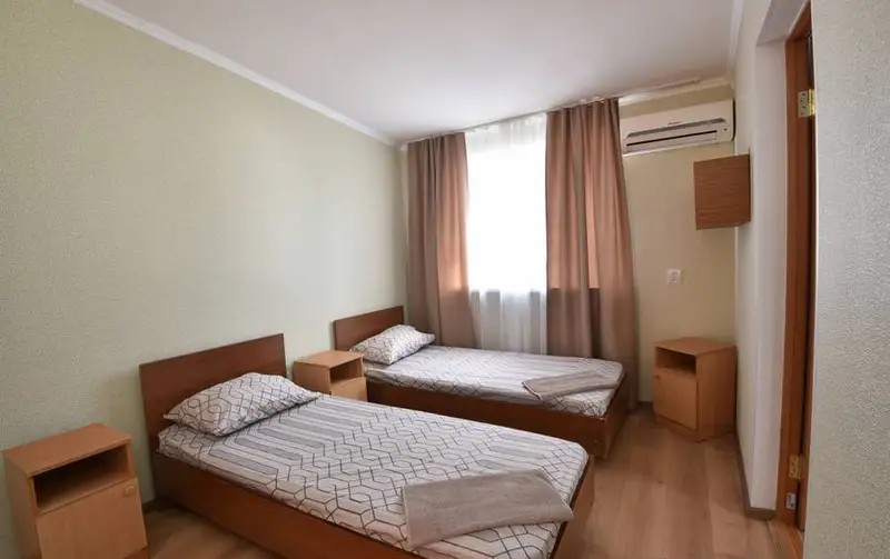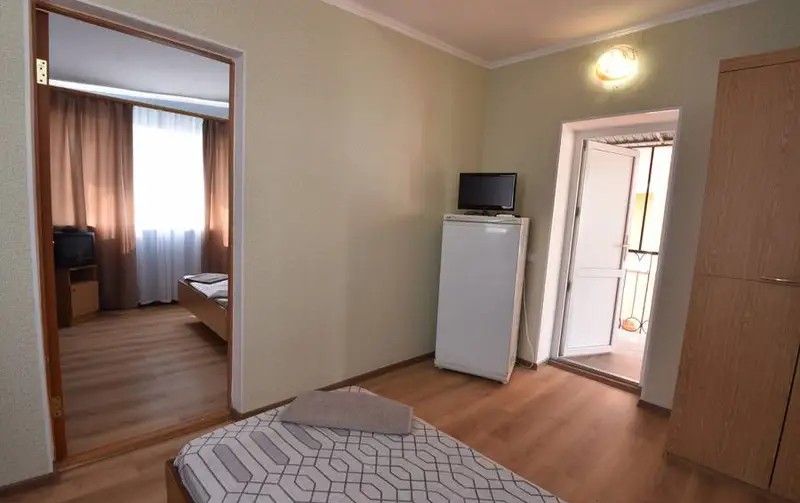 Стандарт 4-местный 2-комнатный. В номере двуспальная и две односпальные кровати, тумбочки, шкаф, стулья, ТВ, кондиционер, холодильник. Санузел совмещенный в номере. Возможна установка доп. места.