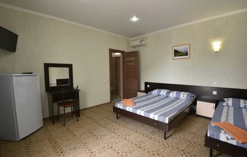 Стандарт 3-местный. В номере двуспальная и односпальные кровати, тумбочки, журнальный столик, туалетный столик, вешалка, зеркало, шкаф, ТВ, кондиционер, холодильник. Санузел совмещенный в номере. Возможна установка доп. места.