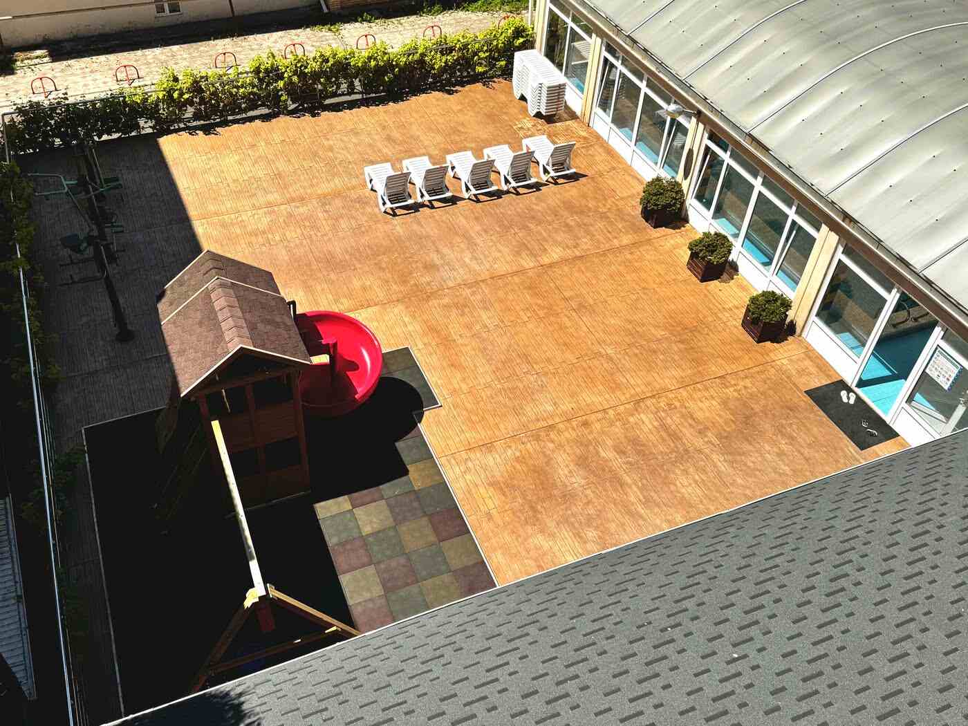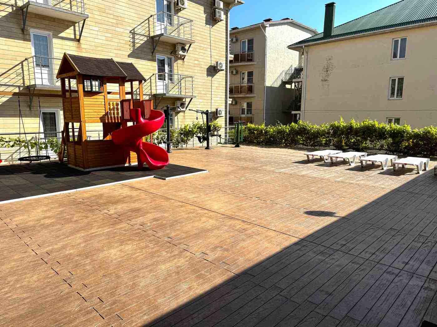 Детская площадка Детский спортивно–развлекательный комплекс мы расположили на нашей террасе. Горка, качели, тренажёры и игровая площадка займут вашего ребёнка. Мы подумали и о безопасности, выбрав специальное напольное покрытие из резиновой крошки.